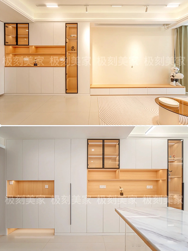 全屋高端定制:柜體板材18厚杉木實芯板,柜門有pet膚感、高光、超晶、五金使用原裝進口奧地利百隆五金