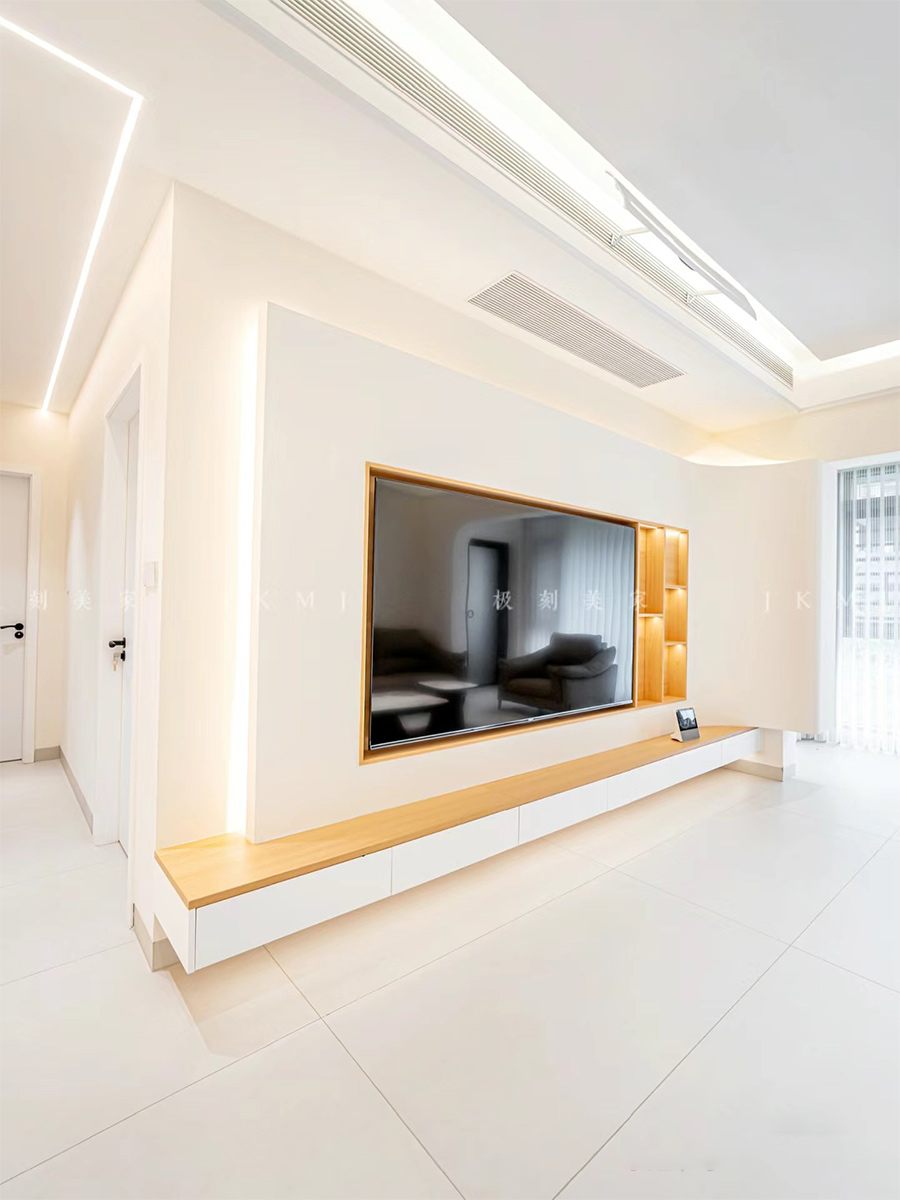 懸浮背景墻設(shè)計(jì)搭配一字型收納柜,顏值與收納并存