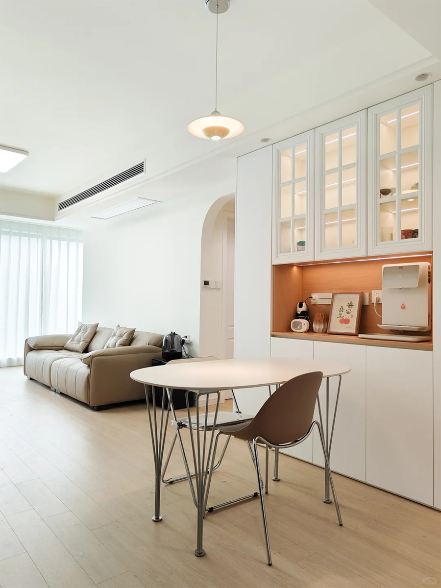 冰箱嵌入嚴(yán)絲合縫,藏露有致的三分段餐邊柜成為點睛亮點。