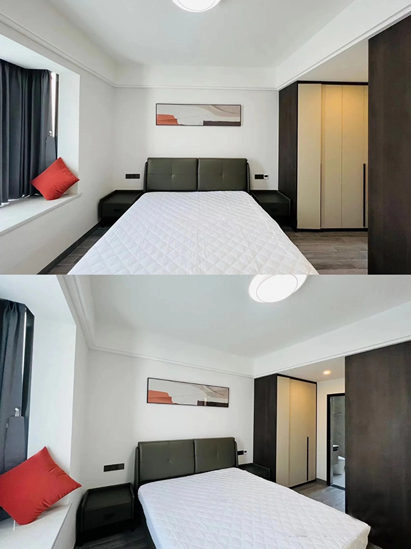 客廳、餐廳、廚房、陽臺都是用大塊淺灰色亮面磚通鋪,無波導(dǎo)線,用灰色美縫,幾乎看不到縫隙,地面整個貫穿,視覺上更亮堂顯大