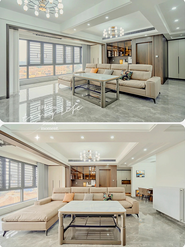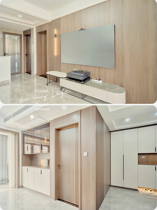 ?全屋多用木飾面元素,增加整體的格調(diào),柜子全房同款同色同造型,搭配燈帶等元素,瞬間拉高氛圍感,柔光瓷磚通鋪,明亮又顯大,視覺(jué)上更加干凈整潔??
