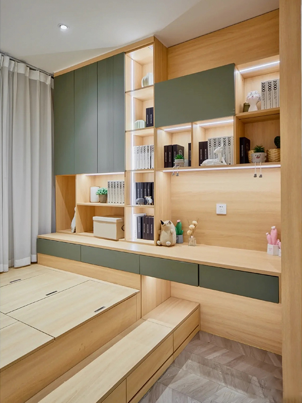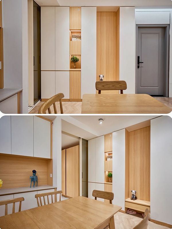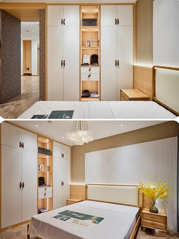 全屋定制:柜體板材是十環(huán)認(rèn)證萬(wàn)象天冠足18厚杉木實(shí)芯板,柜門(mén)做的是歐松板模壓門(mén);五金是奧地利進(jìn)口百隆五金、徹底實(shí)現(xiàn)門(mén)墻柜一體化;