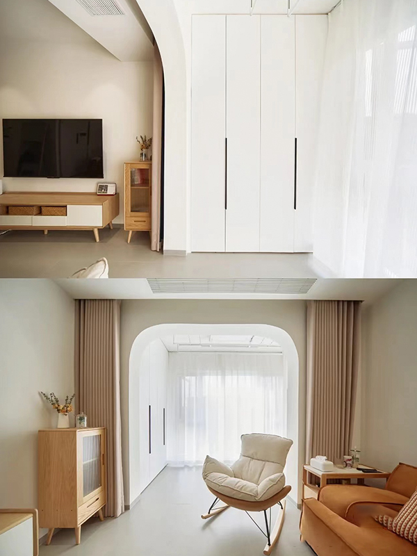硬裝主打大白墻和木飾面,以軟裝來增添家里的氛圍感