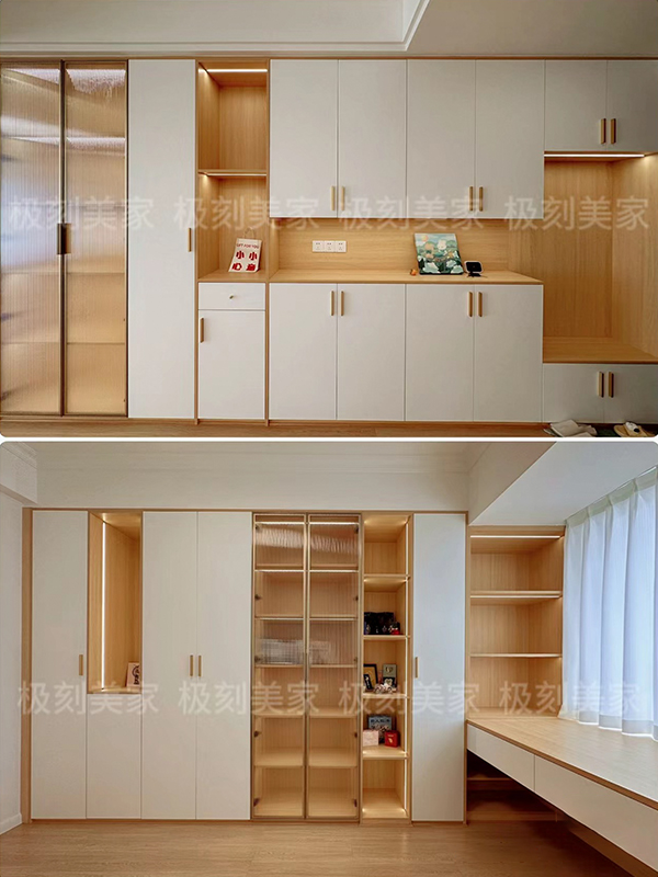 全屋高端定制:柜體板材18厚杉木實(shí)芯板,柜門(mén)有pet膚感、高光、超晶、五金使用原裝進(jìn)口奧地利百隆五金