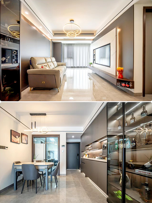 全屋高端定制:柜體板材18厚杉木實(shí)芯板,柜門(mén)有pet膚感、高光、超晶、五金使用原裝進(jìn)口奧地利百隆五金