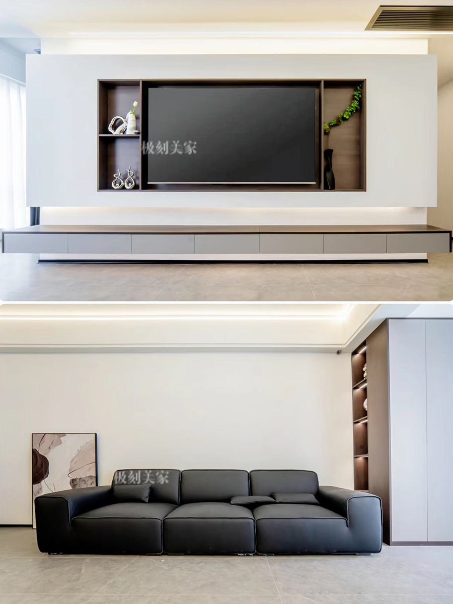 懸浮電視柜搭配內(nèi)嵌電視背景墻,簡(jiǎn)約又大氣