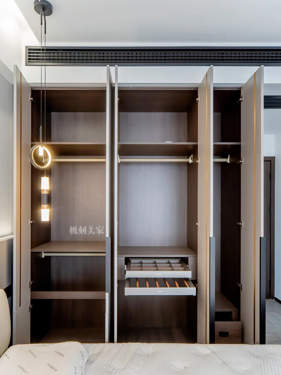 全屋高端定制:柜體板材18厚杉木實(shí)芯板,柜門(mén)有pet膚感、高光、超晶、五金使用原裝進(jìn)口奧地利百隆五金