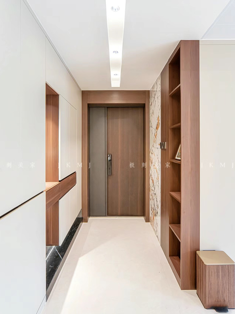 入戶柜做開放格設(shè)計(jì),連接轉(zhuǎn)角書房,空間收納最大化