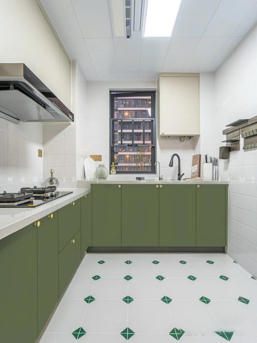 浪漫又復(fù)古的裝修氛圍,全屋以奶油白、牛油果綠、焦糖色為主