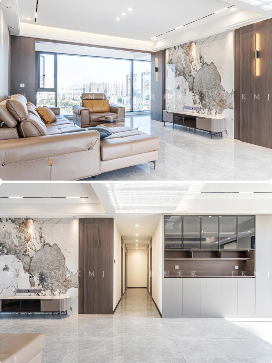 電視背景墻采用巖板裝飾,與整體灰色調(diào)相碰撞,更有質(zhì)感