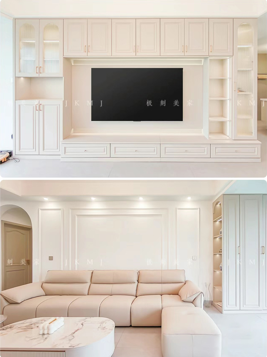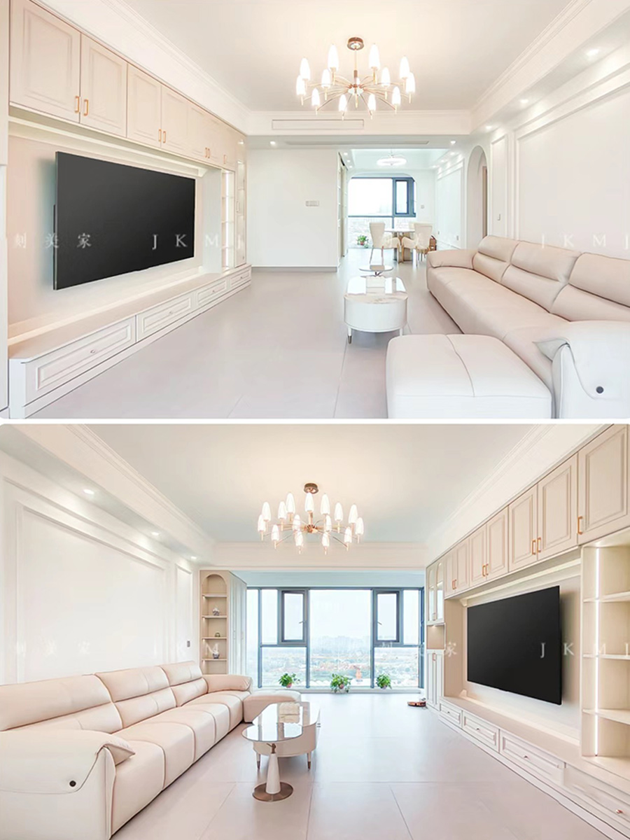 電視背景墻做滿(mǎn)墻,運(yùn)用象牙灰做柜體柜門(mén),整體色調(diào)統(tǒng)一