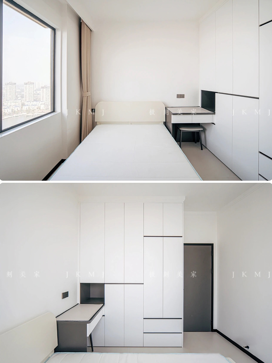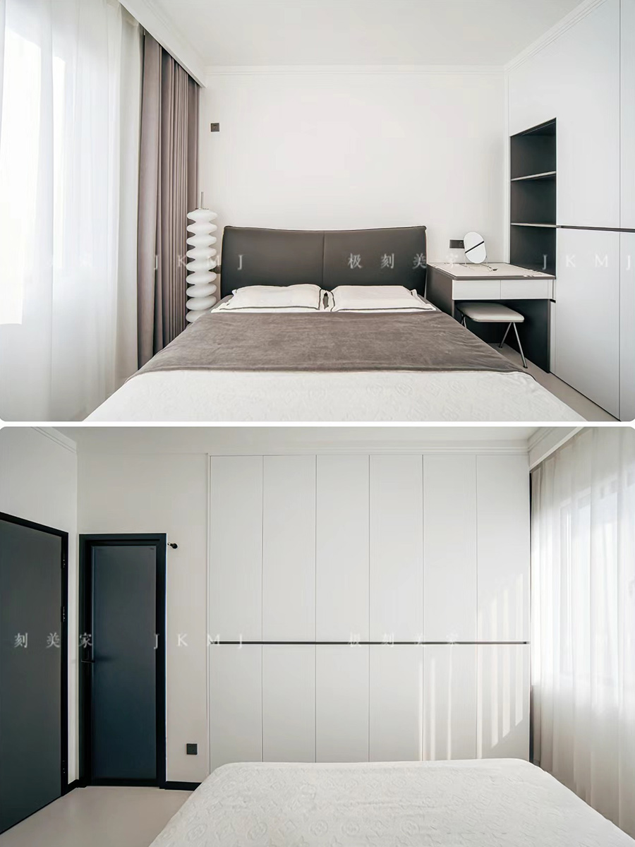 臥室延用白色極簡(jiǎn),做分段式柜門無(wú)拉手設(shè)計(jì),簡(jiǎn)單又高級(jí)