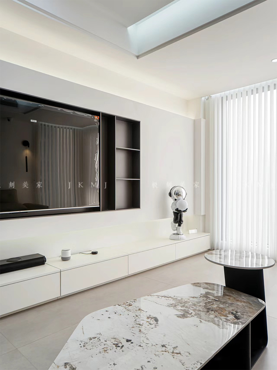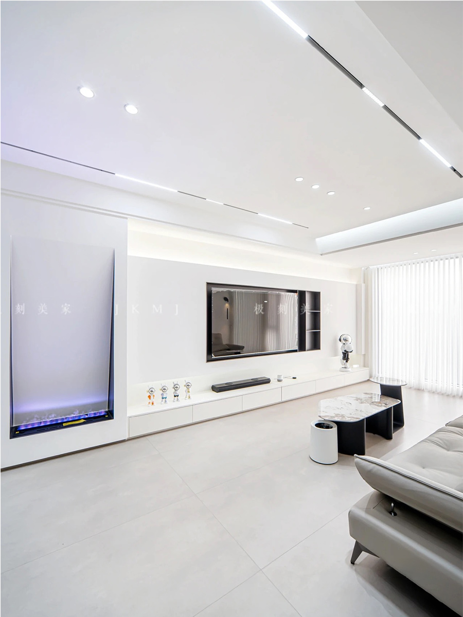 電視背景墻做懸浮設(shè)計(jì),搭配一字型地臺(tái)和加濕器觀景,顏值與收納并存