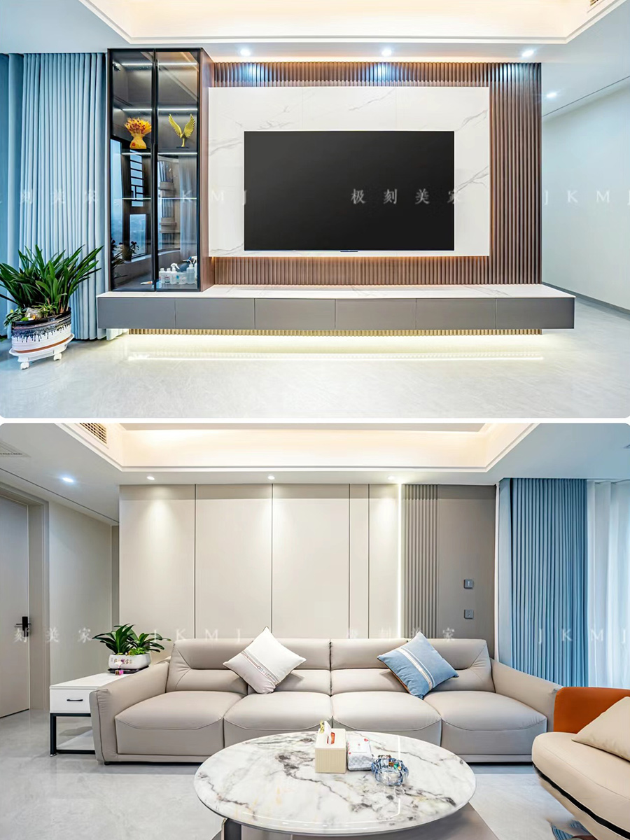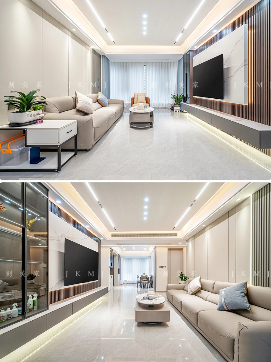 懸浮電視背景墻搭配L型收納柜,顏值與收納并存