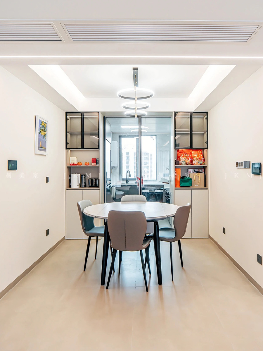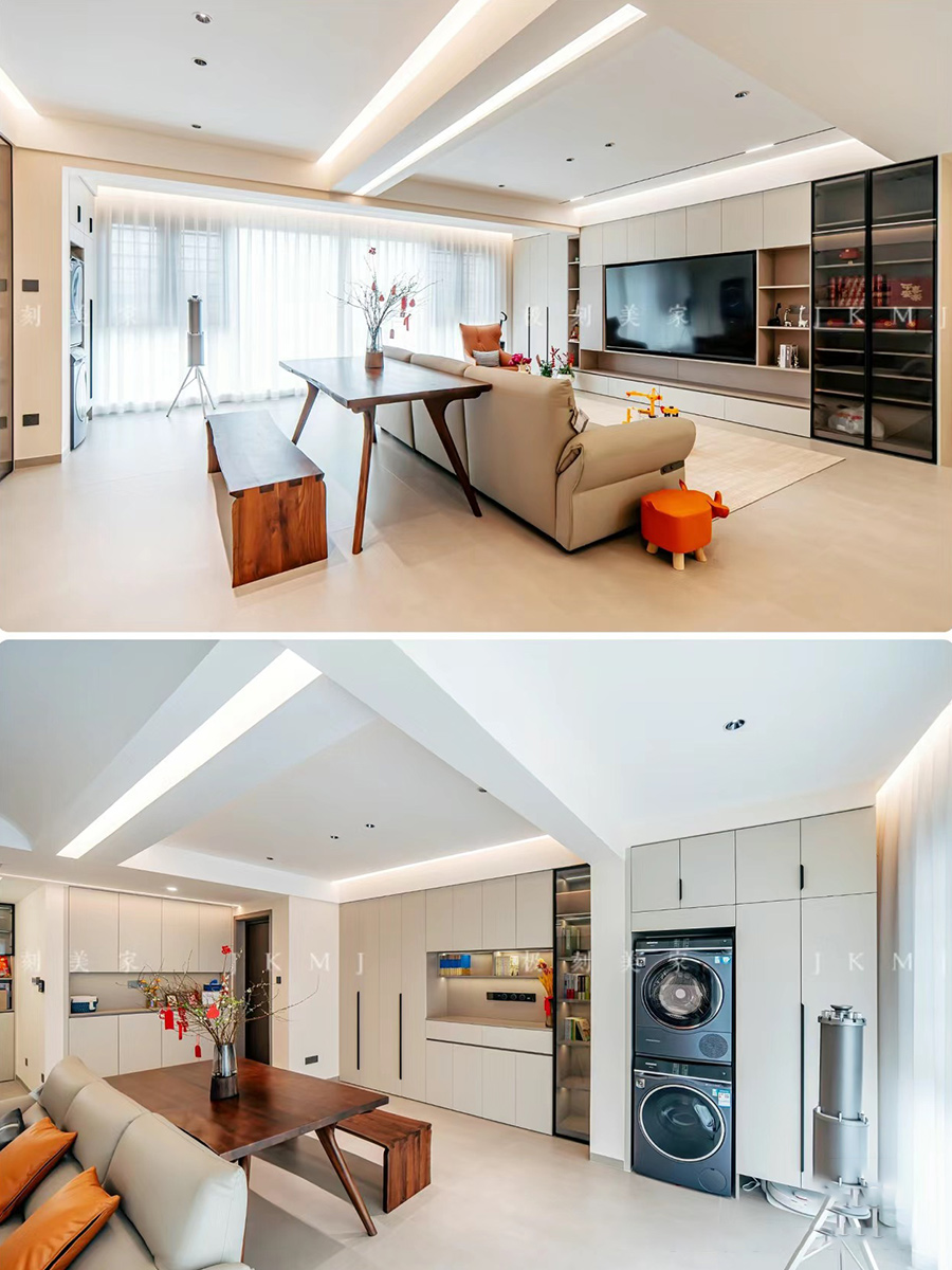 保留不可拆除的橫梁,嵌入燈帶,搭配無主燈設(shè)計,整體簡單又高級