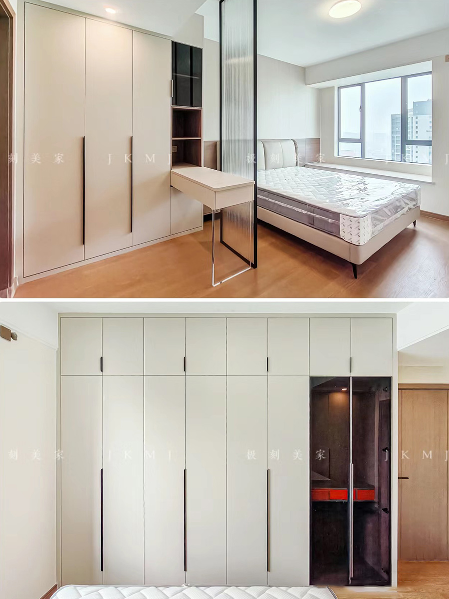 全屋高端定制:柜體板材18厚杉木實芯板,柜門有pet膚感、高光、超晶,五金使用原裝進(jìn)口奧地利百隆五金
