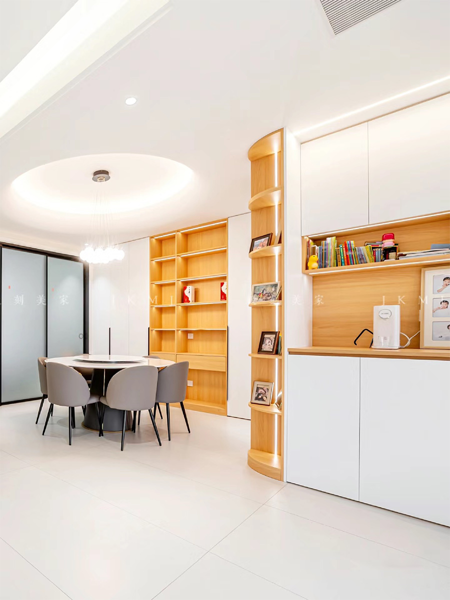 開放式布局設(shè)計,餐廚相對而立,弧形收納柜的融入,更有設(shè)計感