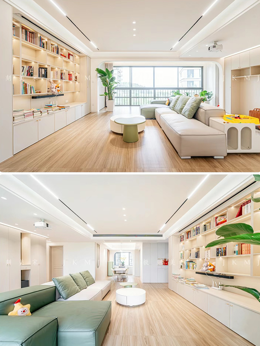 拋去常規(guī)的客廳設(shè)計(jì),打造去客廳化滿墻書(shū)柜設(shè)計(jì),充滿書(shū)香氣息