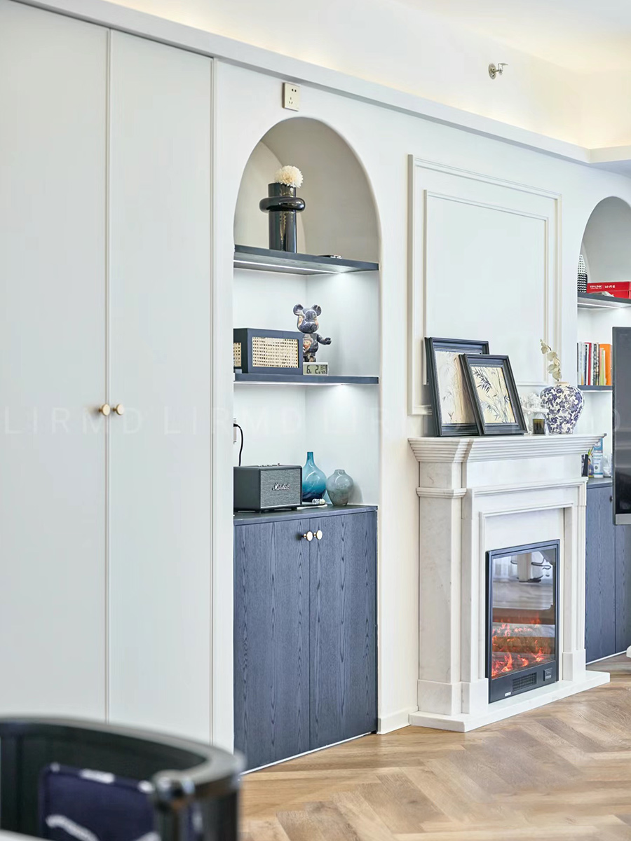 餐邊柜位置用寶格麗巖板做開放長(zhǎng)格式設(shè)計(jì)搭配軌道插座,方便放置家用電器。上方長(zhǎng)虹玻璃搭配,更加凸顯法式復(fù)古。搭配壁爐裝飾,更加凸顯高級(jí)奢華。