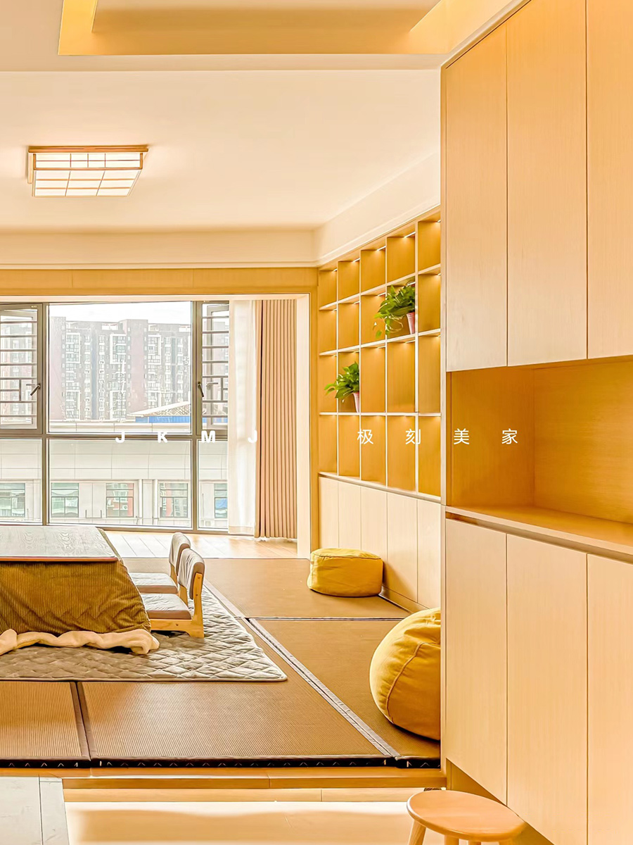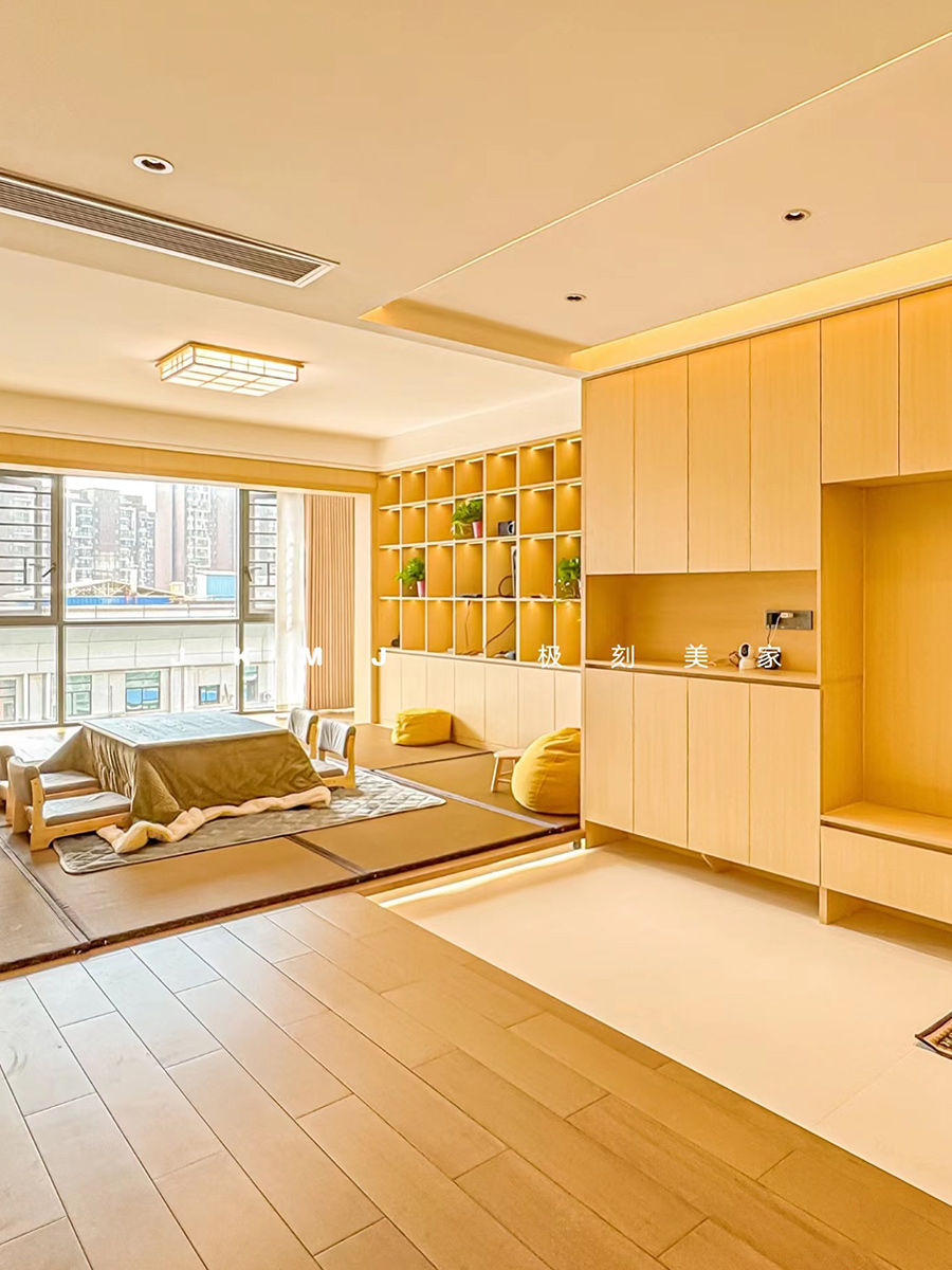 日式吊燈+大平層拉伸層高,全房木墻板,每個場景搭配起來都非常舒適。