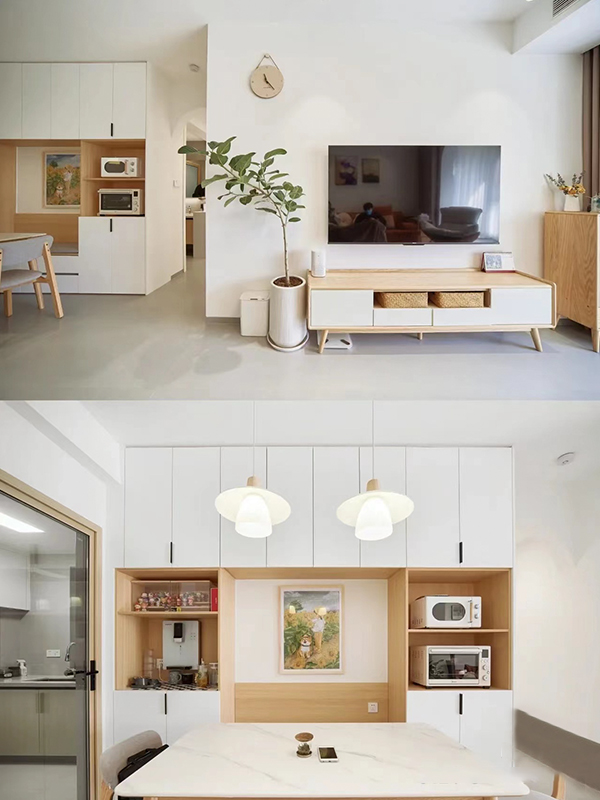 硬裝主打大白墻和木飾面,以軟裝來(lái)增添家里的氛圍感