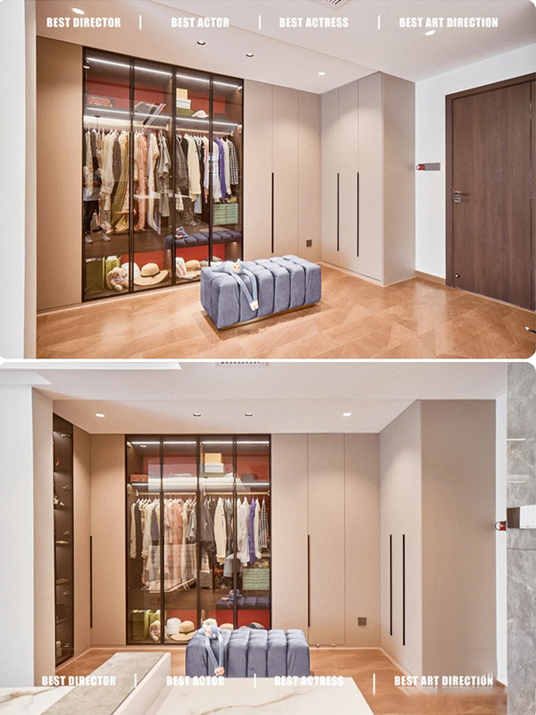 全房共定制了14個(gè)柜子,柜體采用足18厚杉木芯板,柜門采用LSB板PET膚感柜門,一門到頂,五金使用原裝進(jìn)口的百隆五金