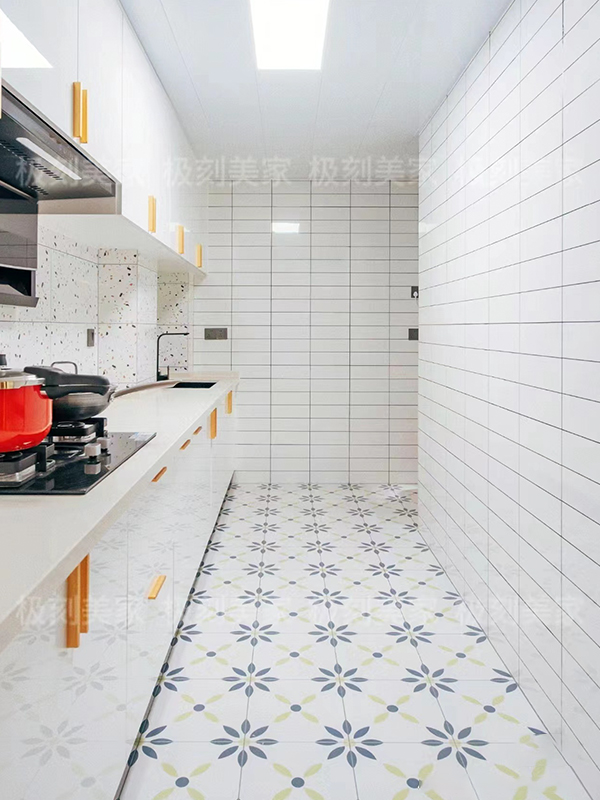 地面復(fù)古花磚的延伸感讓廚房看起來(lái)更大