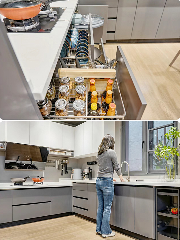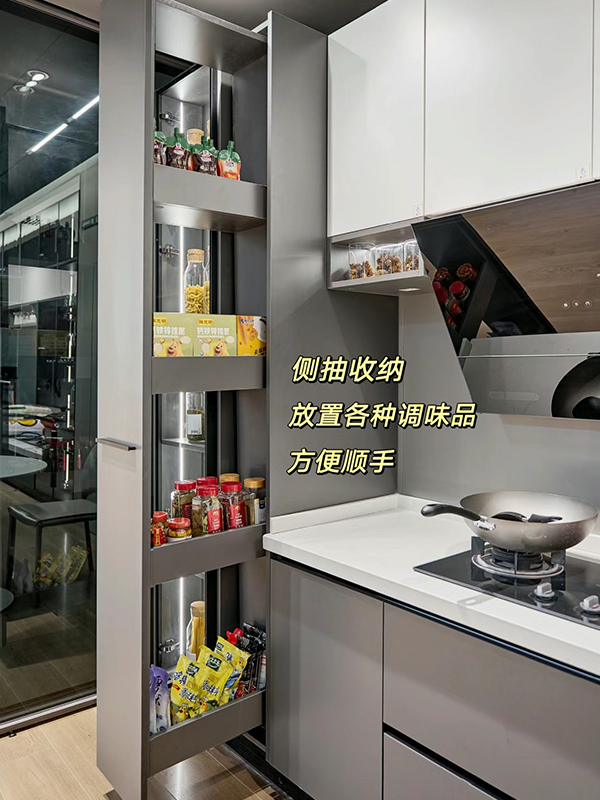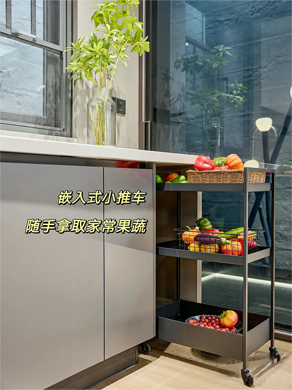 在烹飪區(qū)左手位置設(shè)置一個(gè)抽拉柜,各種調(diào)味品囤貨都可以整齊擺放在這里。拿取順手方便。備菜區(qū)臺(tái)盆留出位置放一個(gè)小推車,日常蔬果直接放這里也不占地方。