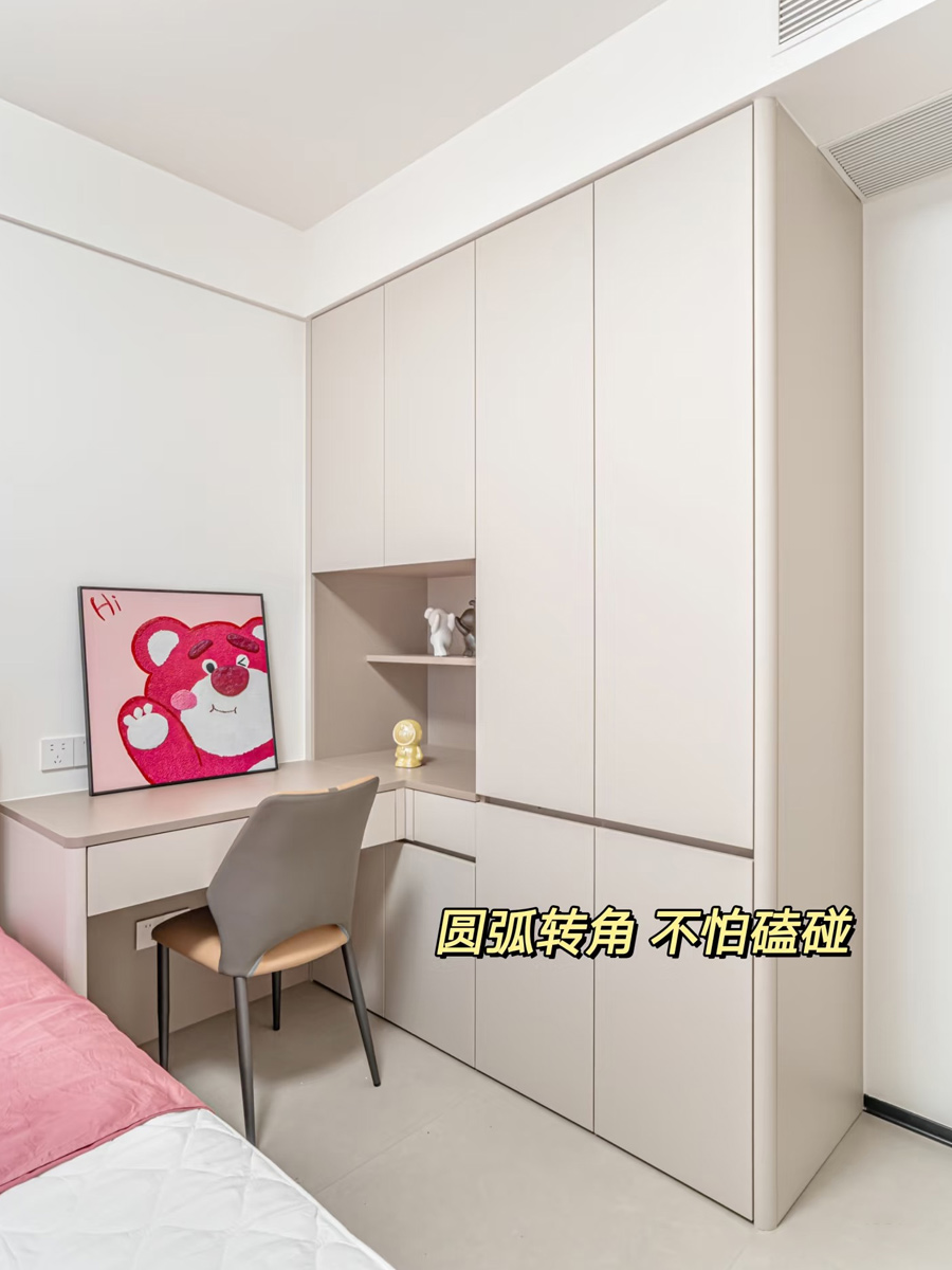 兒童房做圓弧轉(zhuǎn)角、分段免拉手設(shè)計(jì),不怕磕碰受傷。衣柜床頭柜一體簡(jiǎn)約省空間