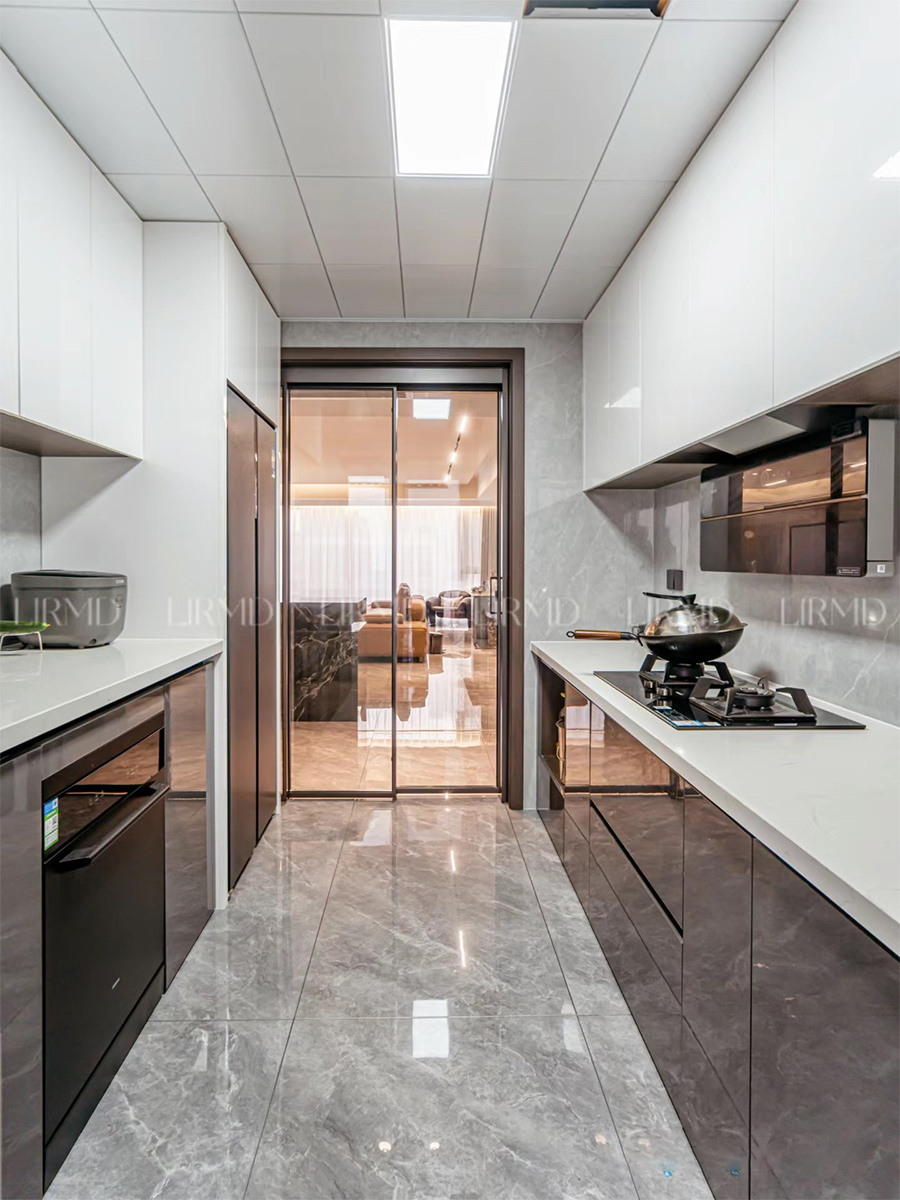 輕于形 奢于質(zhì) 意式輕奢 整體色調(diào)高級(jí)深灰色調(diào)搭配,用巖板打破整體空間深沉感,讓空間層次和效果體現(xiàn)更高級(jí)感。