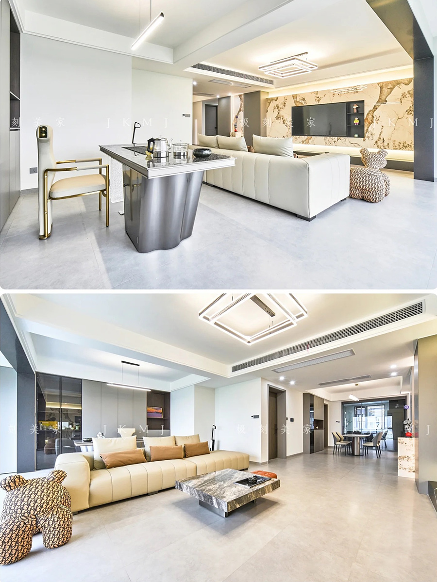 電視背景墻采用巖板+燈帶設(shè)計,銜接同色系端景