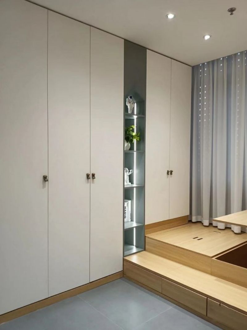 2、榻榻米設(shè)計上翻柜門,巧用底部空間做收納,備用被子、換季衣物都能安心存放,收納空間妥妥的