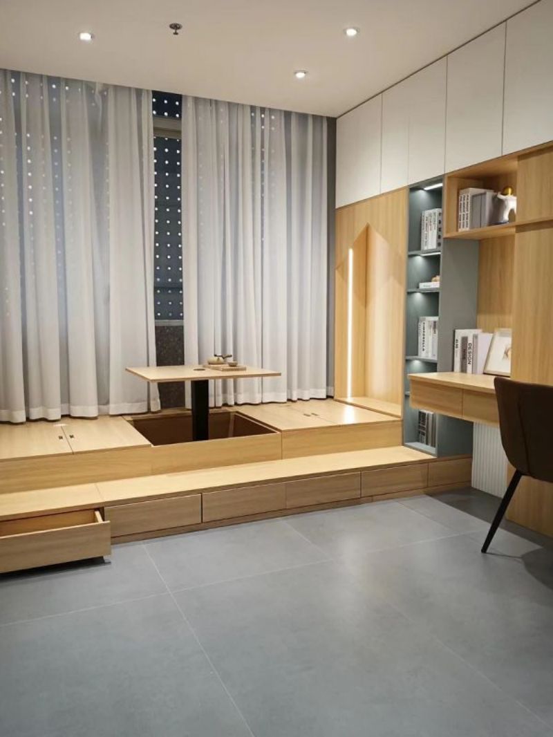 3、電動升降桌也很實用?。∵@不就把茶室搬到書房了嗎,搭配鋪墊和椅子,真有日式禪意那味兒了