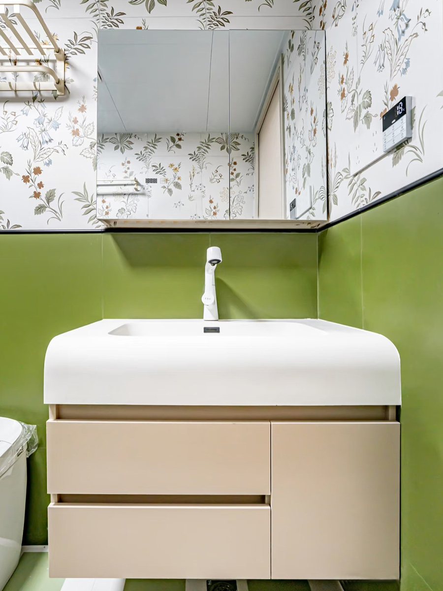 全房以濃郁的綠、黑、暖棕點(diǎn)綴,復(fù)古氛圍鋪面而來!