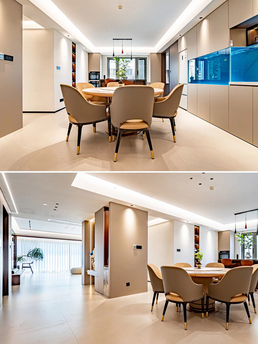餐廳—島臺(tái)—西廚—中廚,功能分區(qū)明確,餐邊柜還留出魚缸造景區(qū)域,動(dòng)線流暢。
