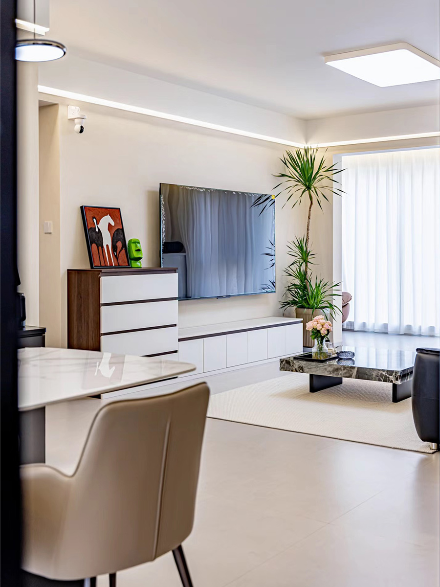 空間里沒有任何的造型過度裝飾,簡單干凈白墻,局部深色調(diào)點(diǎn)綴,高級感中又增加了氛圍感